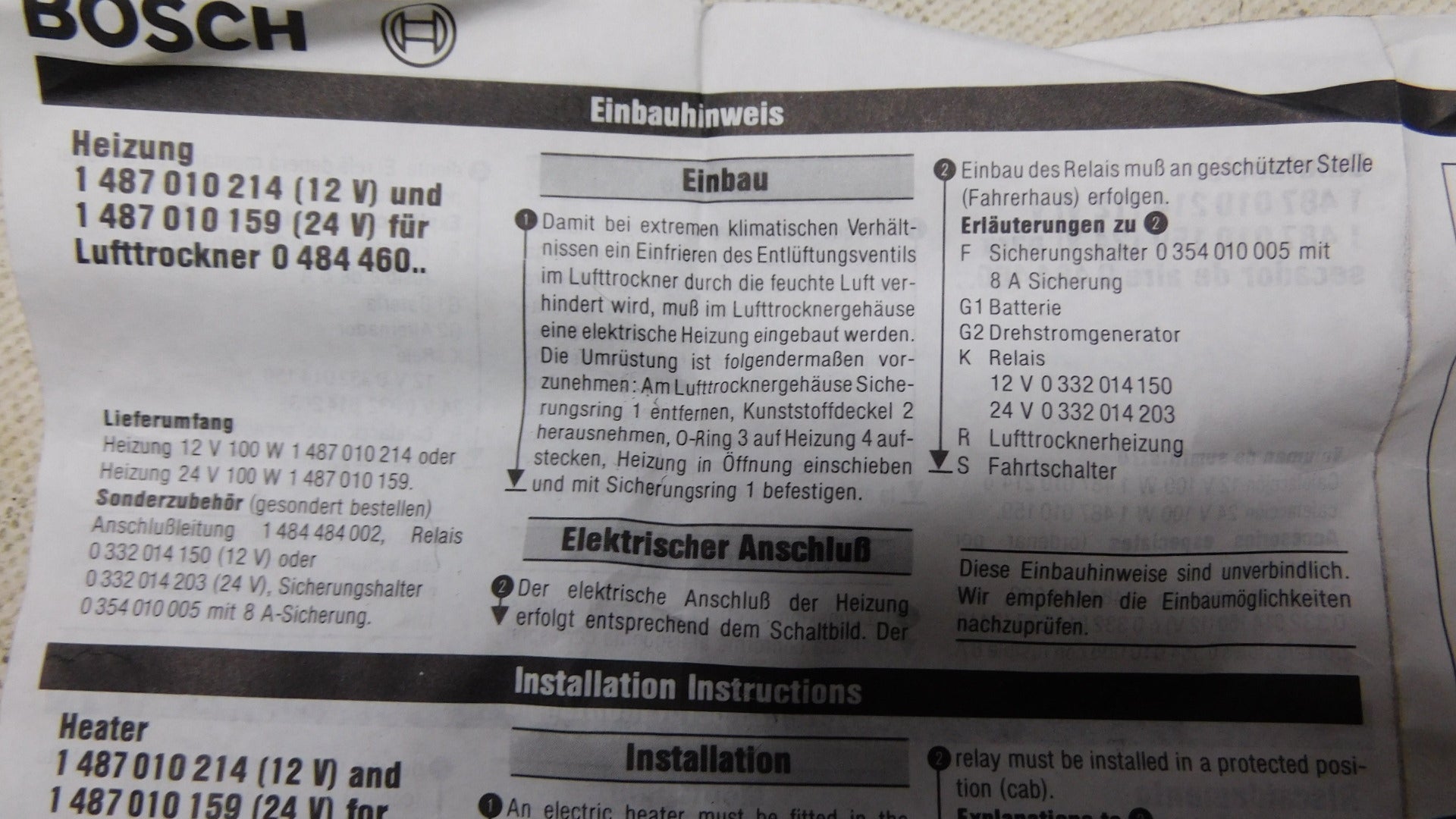 Hersteller Mercedes Benz A0005480670 NOS Bosch 1487010159 für Lufttrockner 0484060.. 1484512005 W 100 24 Volt 15990916